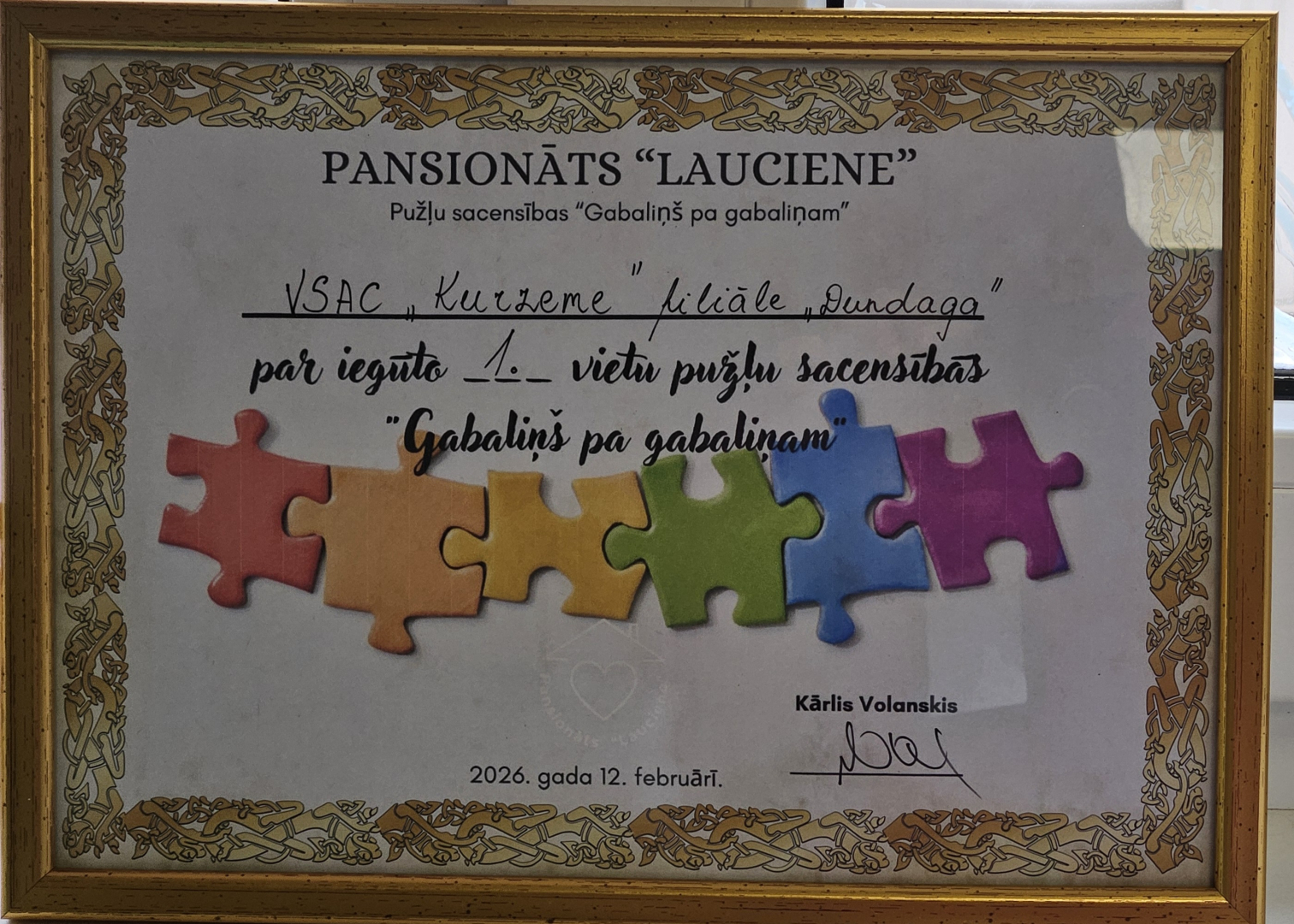 Soli pa solim, gabaliņu pa gabaliņam, vārdu pa vārdam 12.02.2026., VSAC “Kurzeme” filiāles “Dundaga” komanda piedalījās Talsu novada pašvaldības pansionāta Lauciene rīkotajās pužļu sacensībās “Gabaliņš pa gabaliņam”, Sacensībās piedalījās dalībnieki no Pansionāta “Lauciene”, SAC “Tērvete”, Latvijas Sarkanais krusts “Stūrīši” un VSAC “Kurzeme” filiāles ‘Dundaga”.